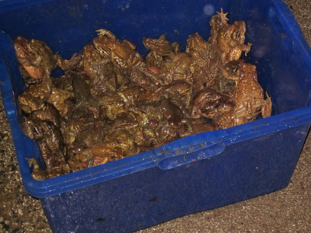 Dimanche 27 Mars 2011 entre 20h30 et 00h00, 3 étudiants en L2 et un étudiant en M1 de l’UBP accompagnés d’étudiants en BTS (17 personnes au total) ont relevé les crapauds du lac de la Cassière avec l’association HYLA63 avant de les relâcher au bord du lac. Le comptage s’est effectué par 2 volontaires placés sur des tronçons de route d’environ 60m avec une fiche de comptage, un seau et une lampe frontale. Il s’agissait de recenser les crapauds communs écrasés et ramassés qui migrent vers le lac de la Cassière en traversant une route très empruntée. Les crapauds ramassés ont ensuite été relâchés au bord du lac. Au final, 846 crapauds ont été collectés (dont 72 écrasés). Il s’agissait probablement de la dernière action de nuit mais il reste encore la collecte matinale, le levé de la barrière et les mares à creuser.