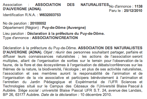 Afin de pouvoir considérer officiellement l’ADNA comme étant une association, il fallait la parution de la constitution de l’association dans le Journal Officiel. C’est désormais chose faite depuis le 25 décembre 2010.