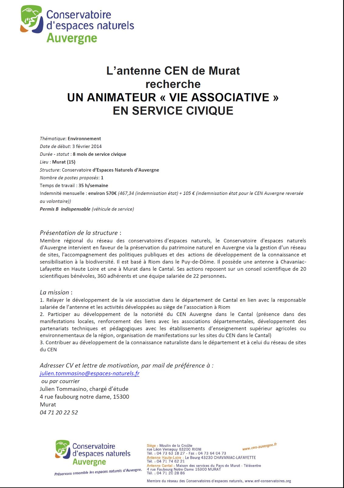 L’antenne CEN de Murat en recherche d’un animateur