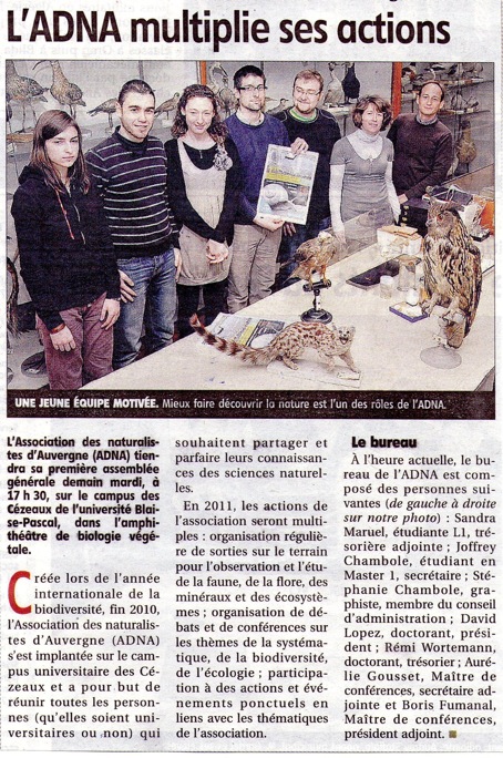 L’association grandit de jour en jour et cherche à se faire connaître au niveau de Clermont-Ferrand et de ses alentours. C’est dans ce but que le bureau a contacté M. Bernard Ronfet, journaliste à La Montagne, qui nous a fait le plaisir de publier un article résumant le rôle et les futures activités de l’ADNA et présentant les membres fondateurs de l’association. En attendant de nouveaux articles sur La Montagne, nous tenons à remercier M. Bernard Ronfet pour nous avoir rencontrés.
