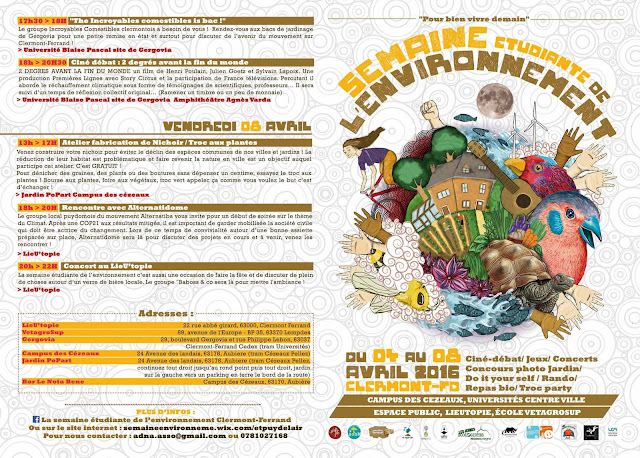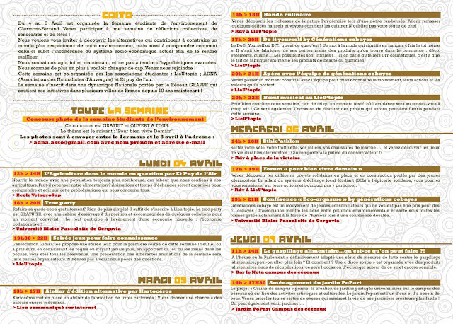 Voici le super programme de la semaine étudiante de l’environnement ! il y en a pour tous les gouts ! Jardin, conférence, troc party, jeux, concert, do it your self …