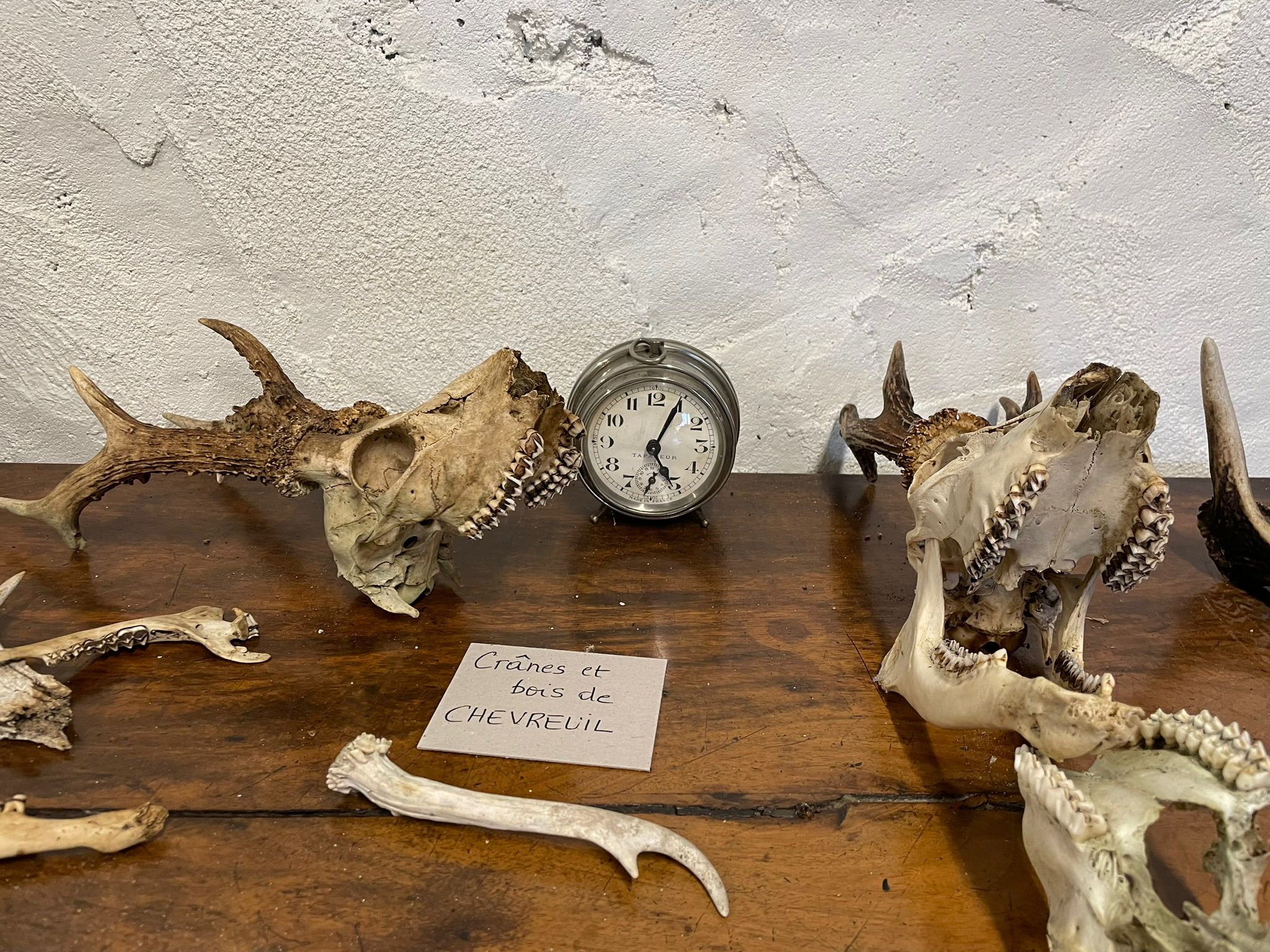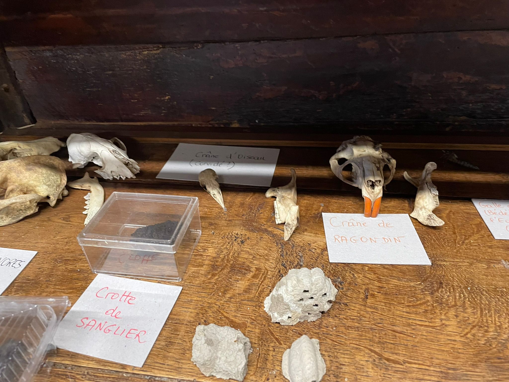 Avant de repartir, nous avons eu la chance de découvrir le cabinet de curiosités avec exposées toutes sortes de trésors du domaine : crânes d’animaux, lichens, champignons,… formant une collection qui a suscité l’intérêt des participants.